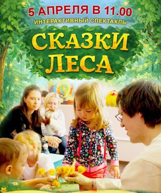 5 апреля в 11:00 «СКАЗКИ ЛЕСА» для детей с 2-х лет интерактивный спектакль, творческие мастерские продолжительность: 1 час 30 минут стоимость -1000 руб. (второй ребёнок - 500 руб., взрослые - бесплатно) запись: 8 910 455 12 80 сменная обувь! |